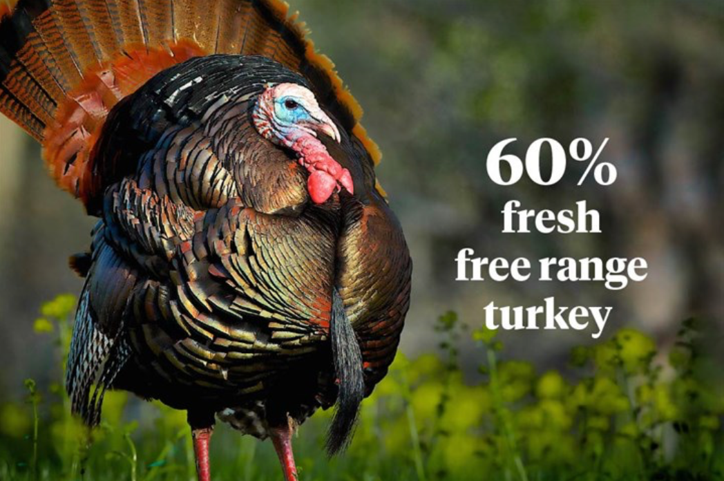 Abychom zajistili, že tento recept je šetrný k žaludku našich pejsků, naším jediným zdrojem bílkovin je čerstvé vykostěné krůtí maso z volného chovu. Vyvinuli jsme novou revoluční techniku vaření, takže můžeme do každého sousta dostat 60 % čerstvého krůtího masa, a to při zachování počtu ingrediencí a potenciálních alergenů na minimum.