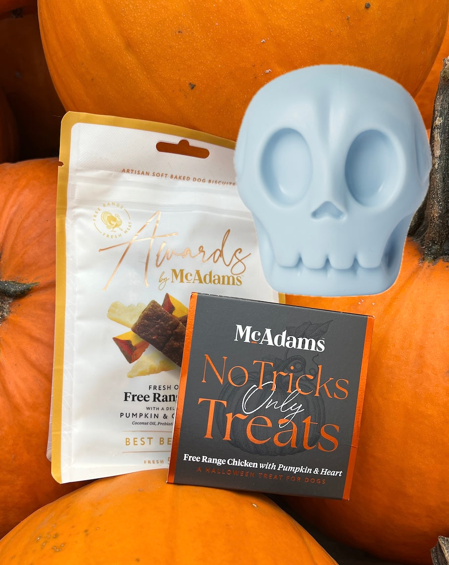 Obsahuje pískací hračku "Lebkouna" 💀 a k tomu nejprodávanější dobrůtky od McAdams: měkké pečené krůtí pamlsky se sýrem Gouda 🧀 a dýní.
